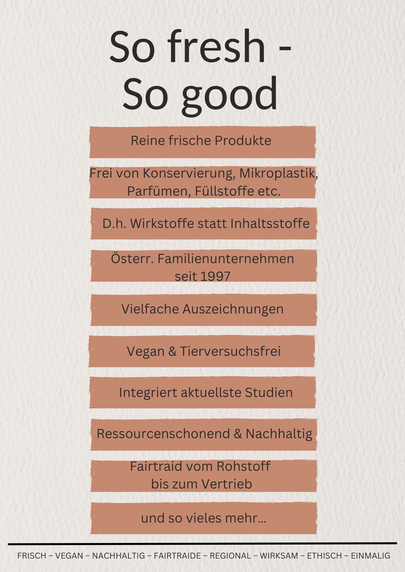 Kein zweites Unternehmen ist dies bisher gelungen. Wir haben hier also nicht nur Naturkosmetik sondern darüber hinaus Frische Pflege/ Frische Produkte.